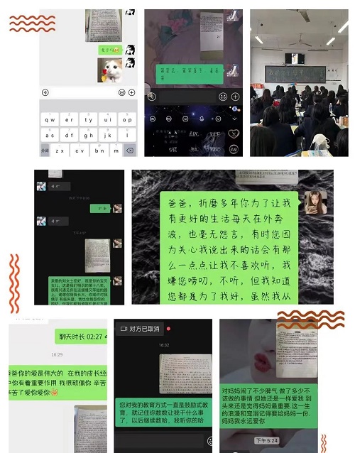 学会感恩父母,体谅父母的不易,不仅是健全人格的需要,更是传承中华民族优良传统的内在要求。为进一步培养学生感恩观念,在各班的班会上,同学们纷纷向世界上最亲、最美丽的人——爸爸、妈妈,献上了属于自己的祝福。简单几行字,电话传乡音;“爸妈辛苦啦”,一抹动人情;高声“我爱你”,瞬间泪沾襟,其中满满寄托着同学们自己对父母的一段深情!