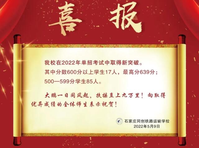 学校发展超越历史,再次跨上新台阶。 近年来,同创铁路运输学校立足特色发展,为给学生提供不一样的道路,就业与升学工作双管齐下,取得了良好成绩。 在此,我校各位领导及全体师生向取得佳绩的同学们表示热烈的祝贺!向辛勤付出的老师们表示感谢!