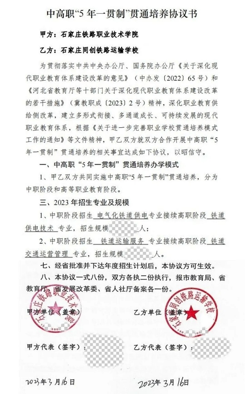 石家庄同创铁路运输学校与石家庄铁路职业技术学院合作开办“3+2贯通”与“五年一贯制”教学正式落地。
