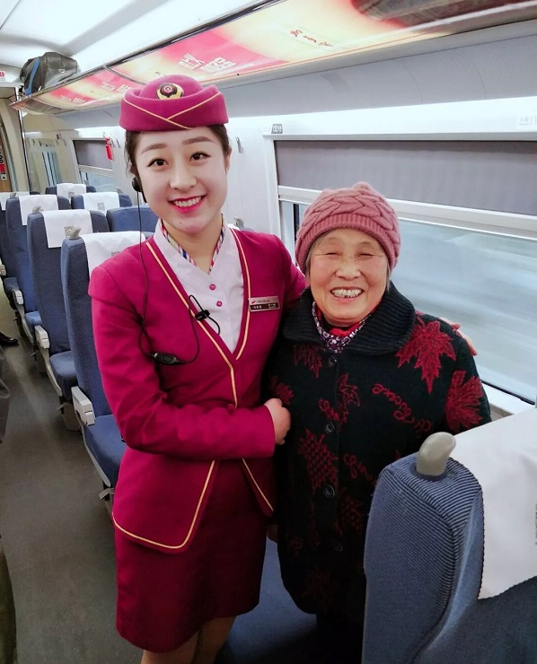 1月30号,马上进入春运,4车的80岁王奶奶独自一人从武汉回家过年,终到贵阳北站需要4个多小时,我马上给她挂上中国结,车长夸我真的用心工作工作,我心里美滋滋的。一路上,我带奶奶去卫生间,给她接水。奶奶拉着我的手说看见我像看见自己小孙女一样亲切,心里特别感动。终到贵阳北站,外边天冷,我给奶奶把衣服穿上,带好帽子,正好车长过来给我拍下了这珍贵的一刻,这是我工作以来的第一张工装照片,我想特别骄傲的回去给爸爸妈妈看看,让他们为我骄傲。以后我要更努力的工作,春运我们准备好了!