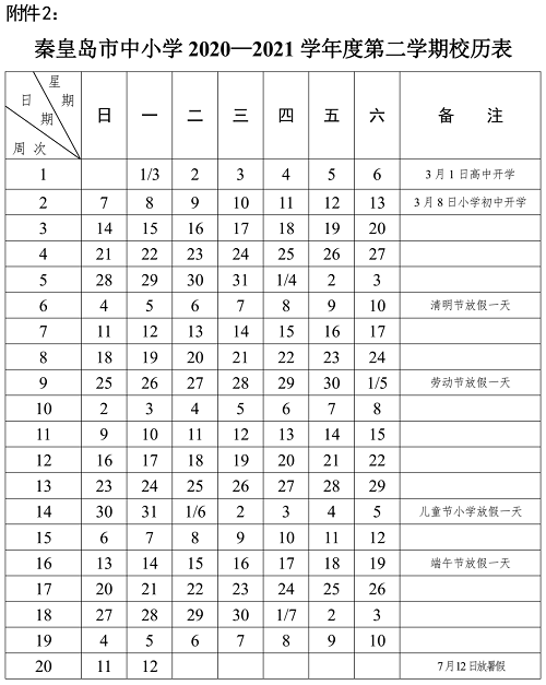 秦皇岛市中小学将于2021年2月1日放寒假,3月1日高中开学,3月8日小学初中开学。