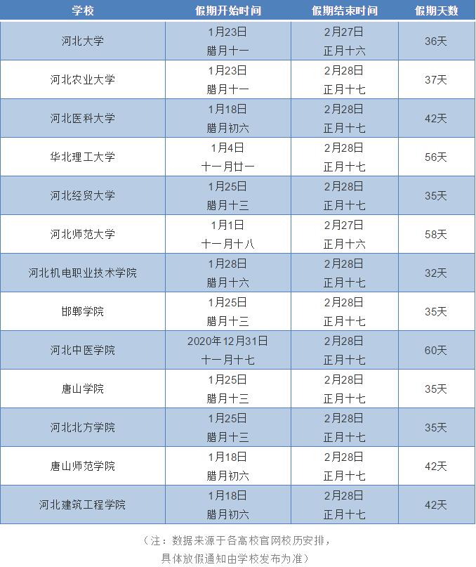 石家庄同铁路学校了解到河北省多地高校寒假安排已经公布,根据了解河北中医学院寒假自2020年12月31日开始,是目前公布的放假最早的高校,假期时间长达60天。